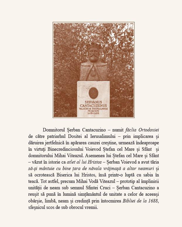 Prima parte este dedicată vieții și personalității domnitorului Șerban Cantacuzino, iar a doua prezintă istoricul, arhitectura și pictura bisericii din perspectivă exegetică. Asemenea altor biserici înălțate de voievozii noștri, și Biserica Doamnei a fost zidită ca un lăcaș de rugăciune al familiei domnitorului Șerban Cantacuzino, părintele tipăriturilor bisericești în limba română și cel numit făclia Ortodoxiei de către patriarhul Dositei al Ierusalimului. Prin implicarea și dăruirea jertfelnică în apărarea cauzei creștine, Șerban Vodă urmează îndeaproape Binecredinciosului Voievod Ștefan cel Mare și Sfânt prin virtuţi, însă ducând o luptă cu sabia în teacă, precum și Voievodului Mihai Viteazul prin întocmirea Bibliei de la 1688, reușind să pună în lumină simțământul de unitate a celor de aceeași obârșie, limbă, neam și credință.