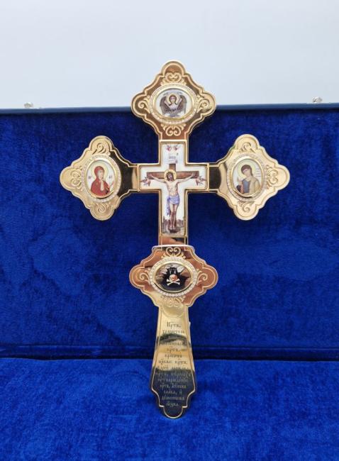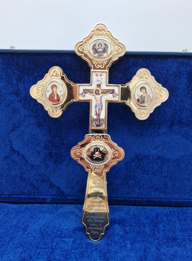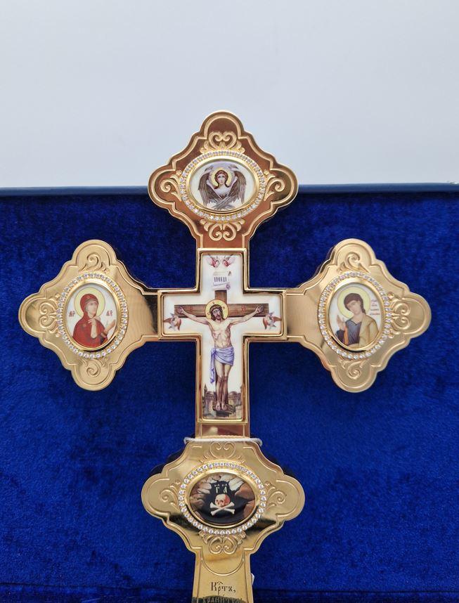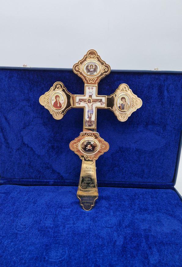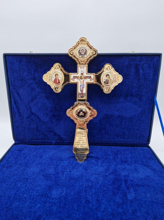 Cruce aurita de binecuvatare ornamentata cu icoane email 31x20 cm