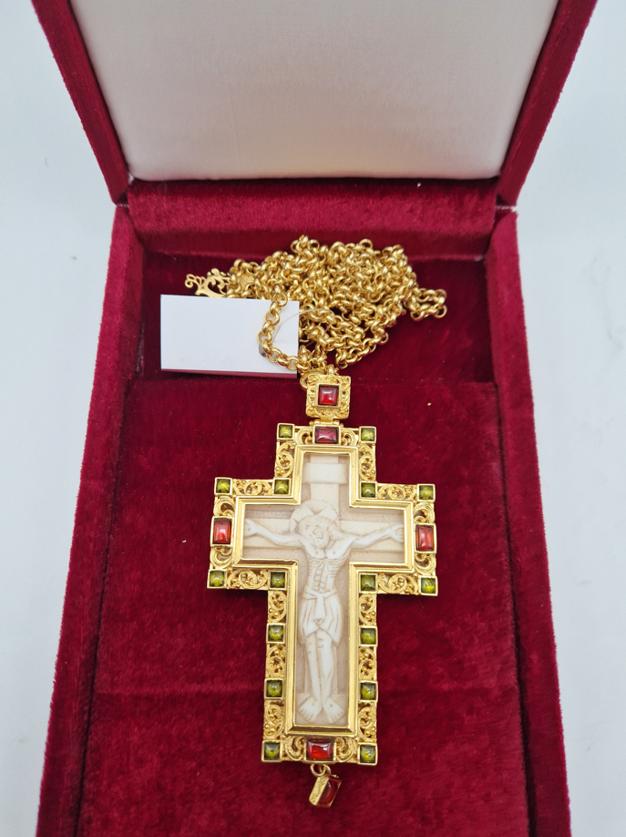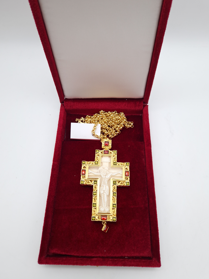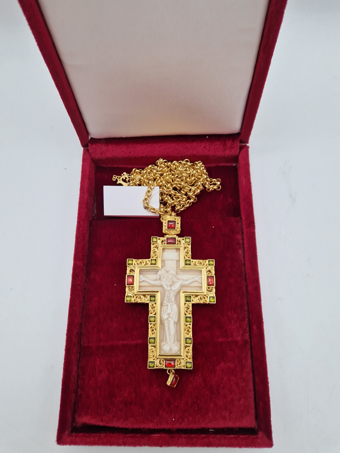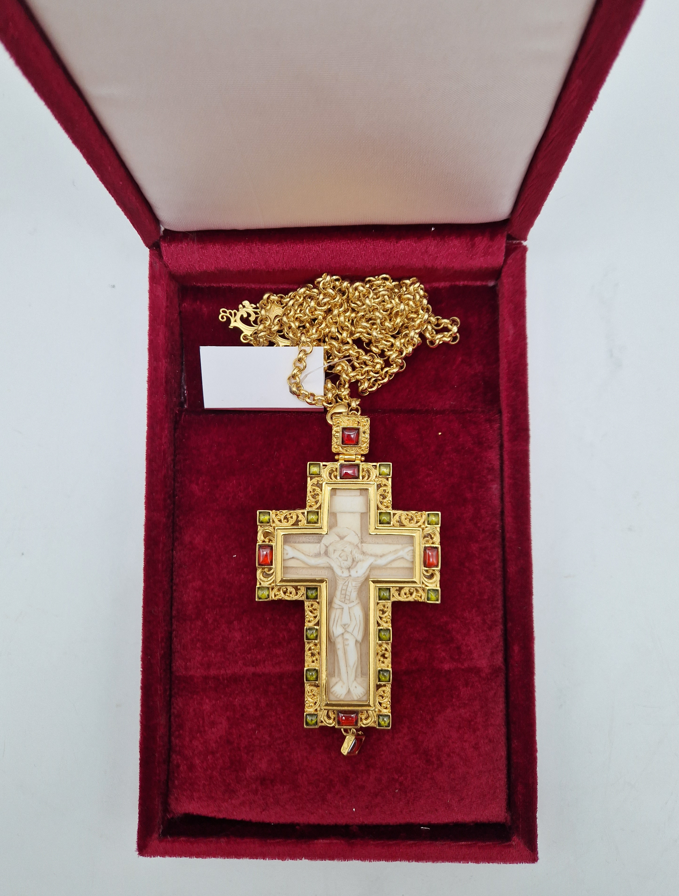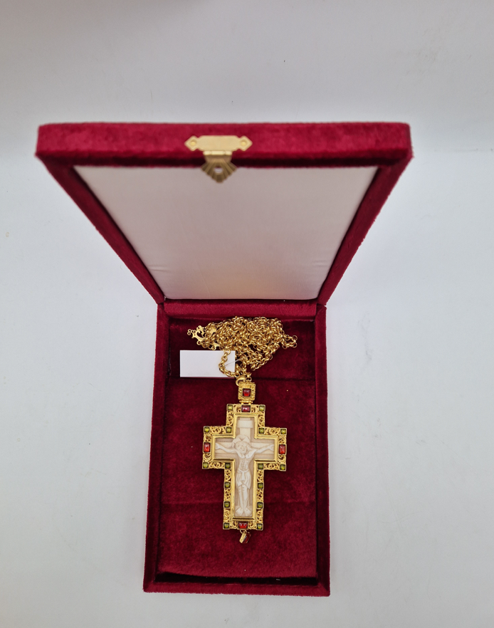 Cruce pectorala aurita cu insertie de fildes ornamentata cu pietre semipretioase