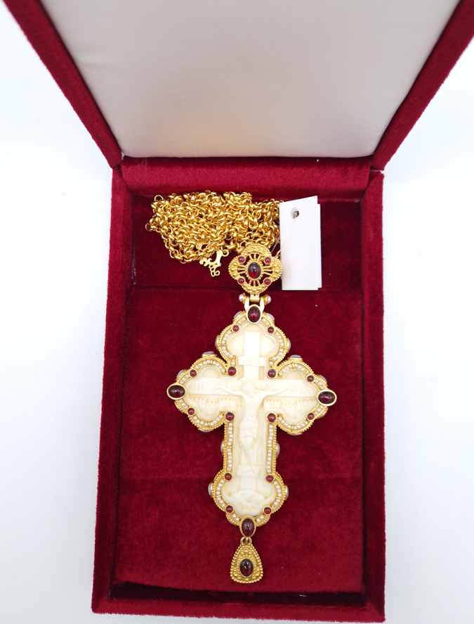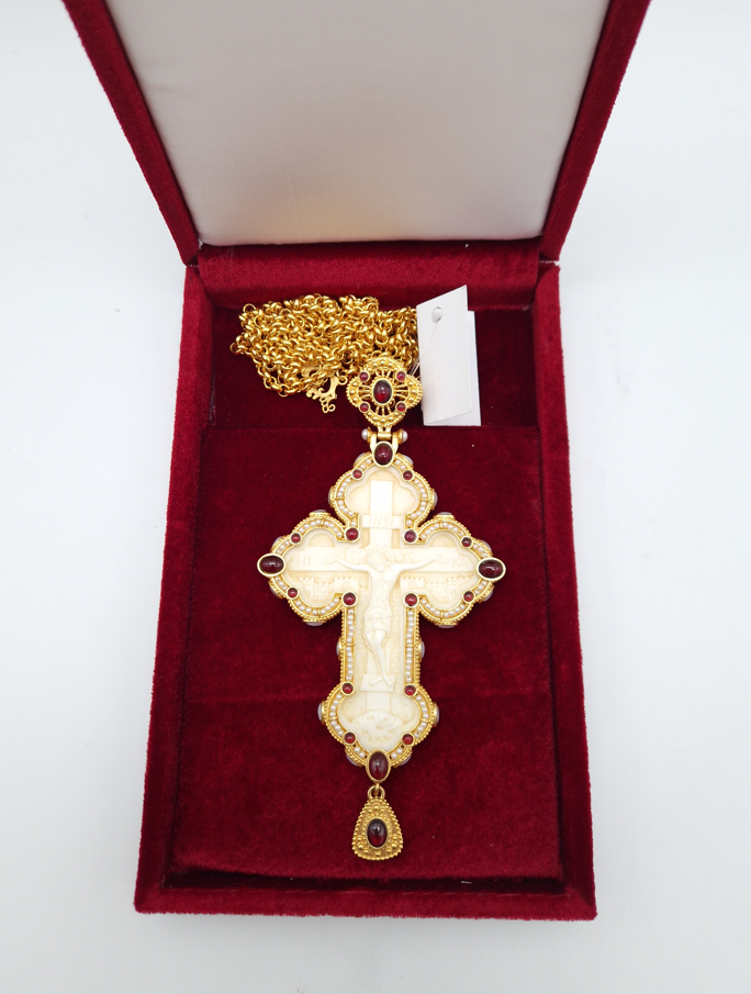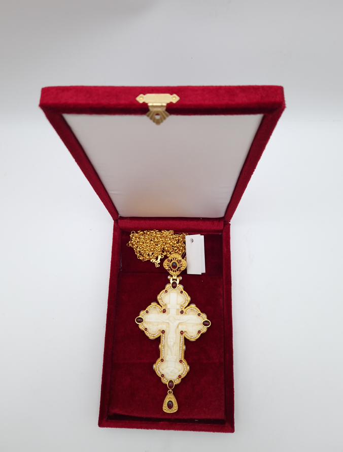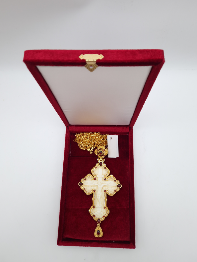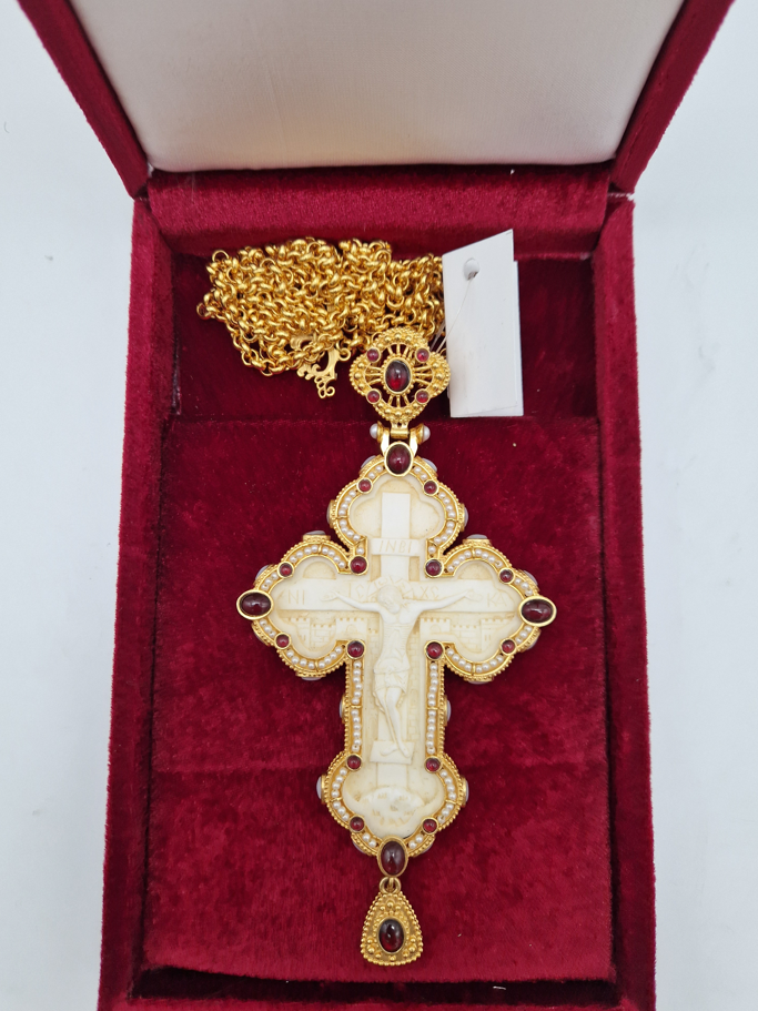 Cruce pectorala aurita cu insertie de fildes ornamentata cu pietre semipretioase 1