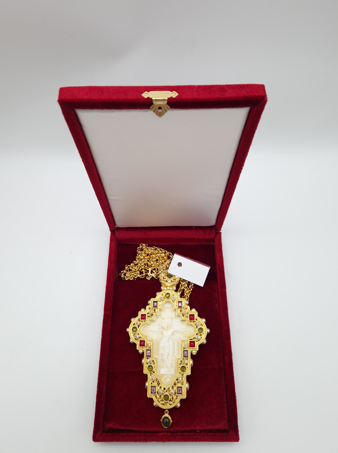 Cruce pectorala aurita cu insertie de fildes ornamentata cu pietre semipretioase 15x9 cm