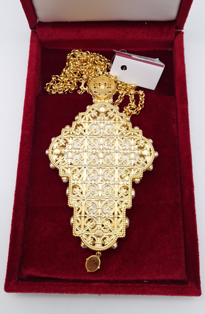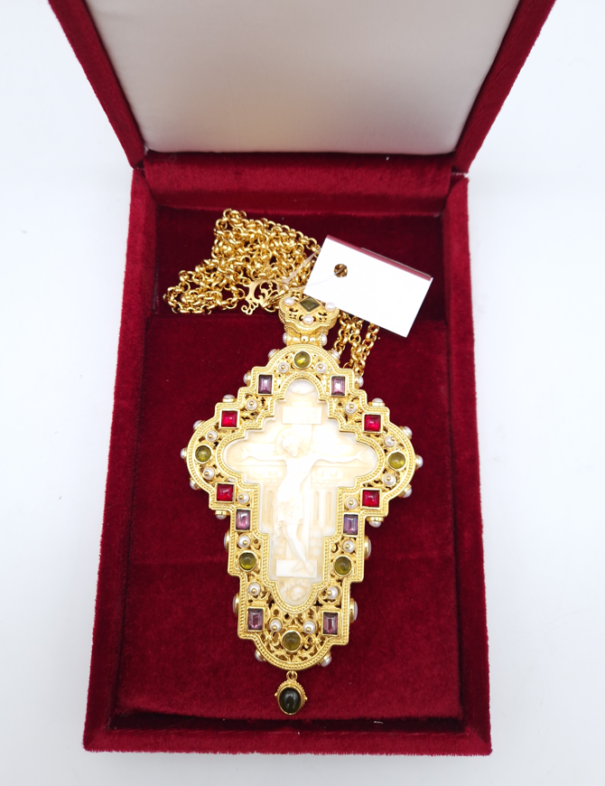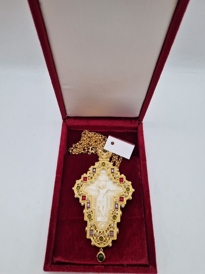 Cruce pectorala aurita cu insertie de fildes ornamentata cu pietre semipretioase - 15x9 cm