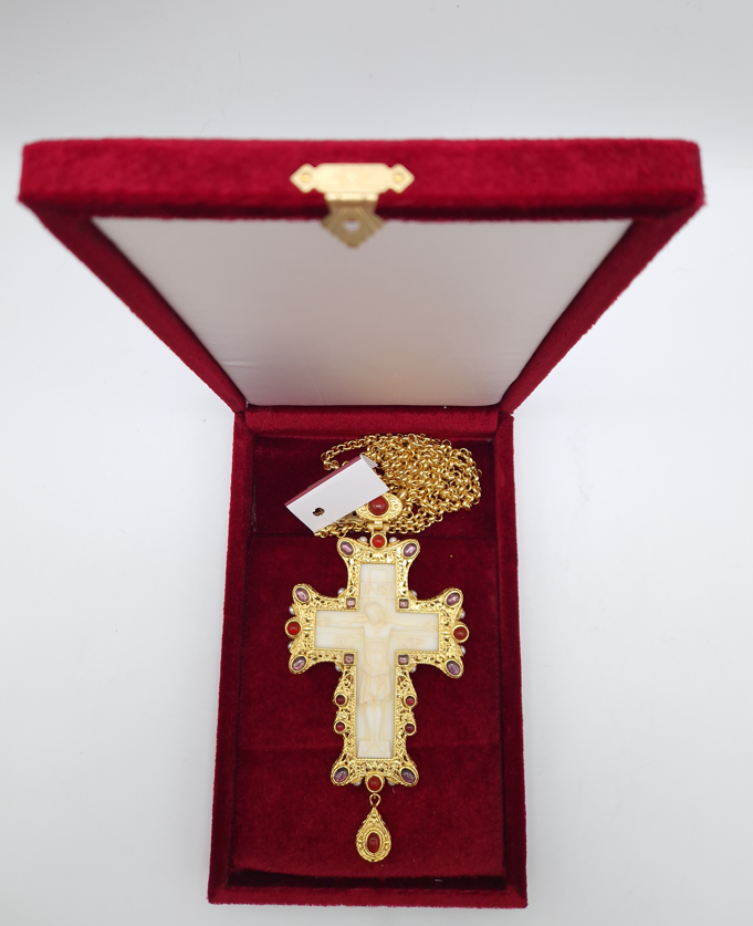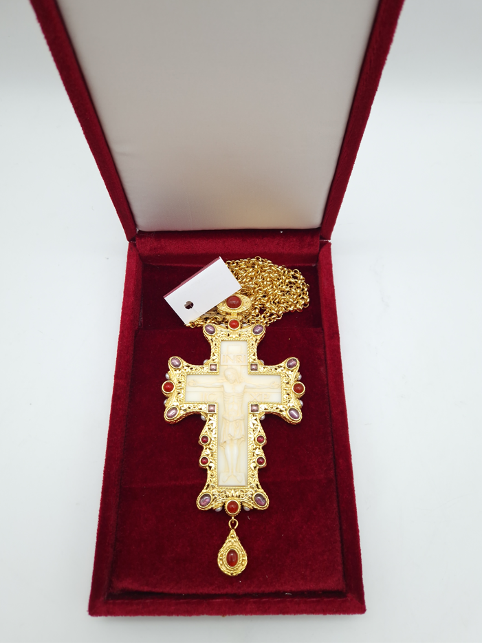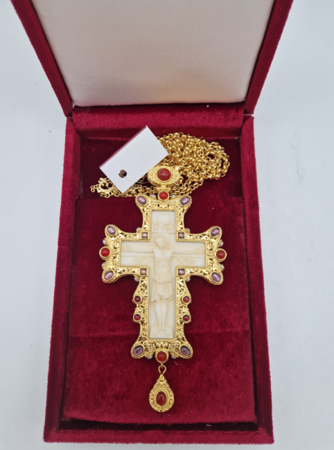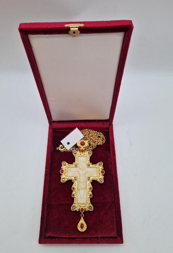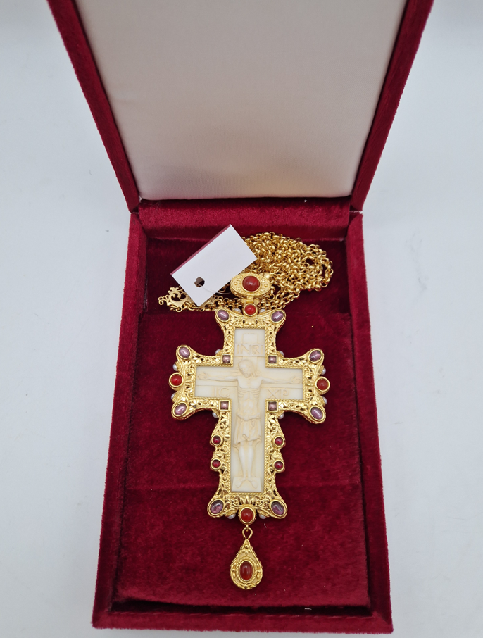 Cruce pectorala aurita cu insertie de fildes ornamentata cu pietre semipretioase