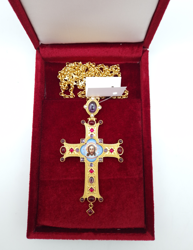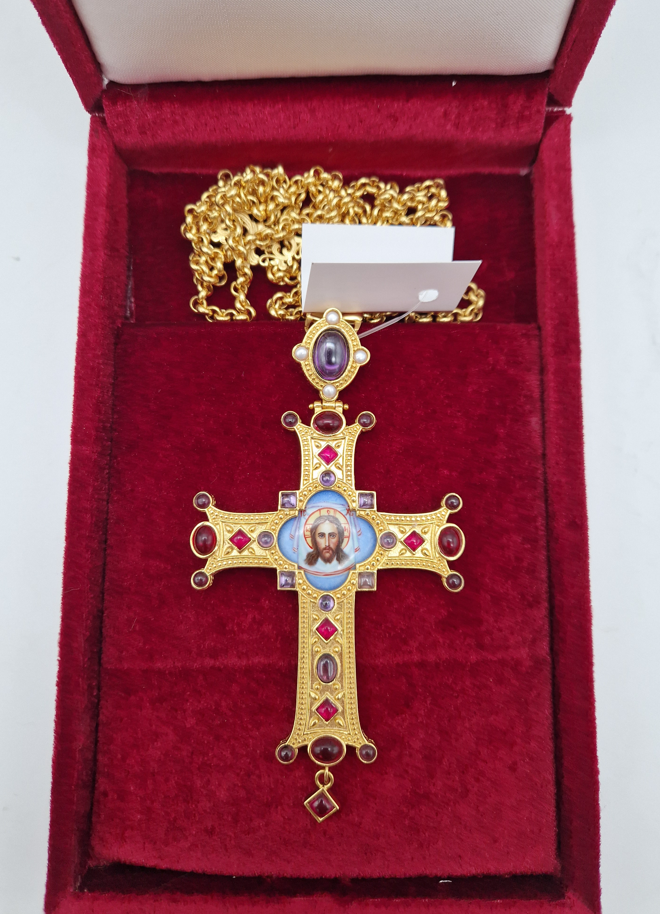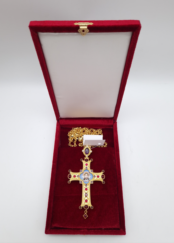 Cruce pectorala aurita ornamentata cu pietre semipretioase