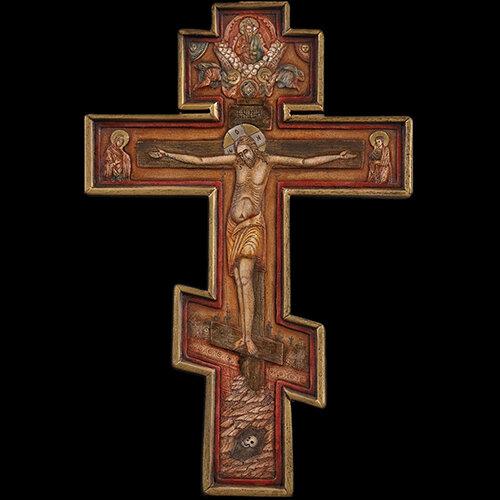 • Lemn, grunduri speciale, tempera, foiță aurită, vernilac si patină.