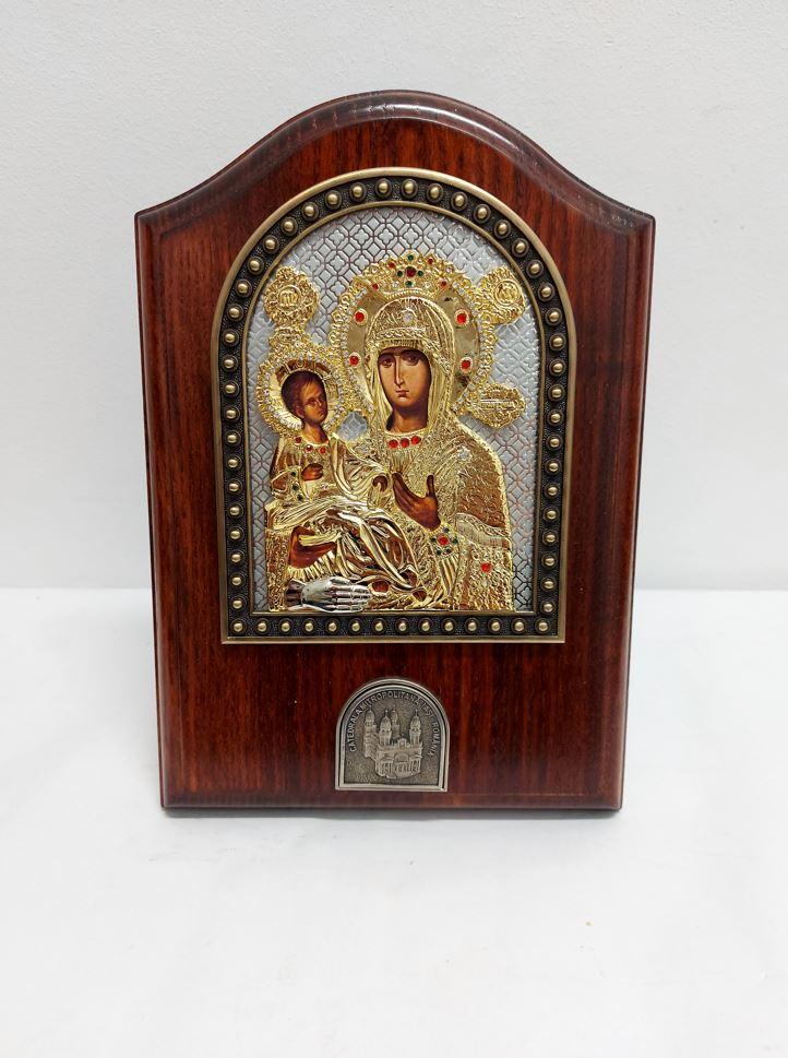 • Icoana aurita si argintata pe blat de lemn cu suport pentru masa thrihirusa 24x17 cm