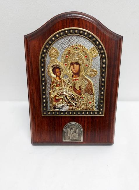 Icoană aurită și argintată pe blat de lemn cu suport pentru masă - Thrihirusa 24x17 cm
