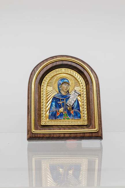 Icoana este realizată după modelul icoanelor ferecate medievale, în tehnică mixtă, cu metal înnobilat prin aurire cu aur 24 k, argint 925, împodobită cu cristale de zirconiu.