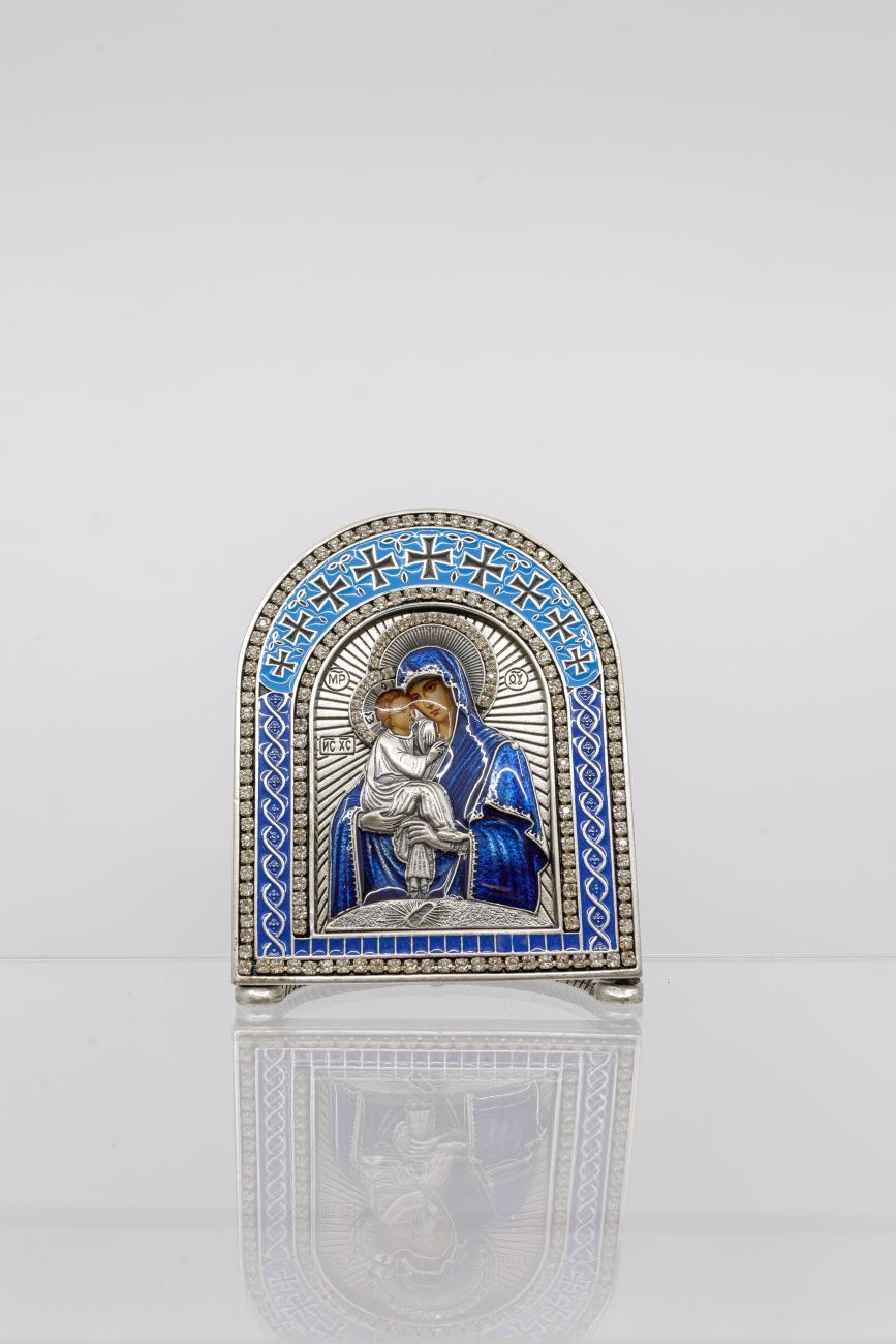 Icoana este realizată după modelul icoanelor ferecate medievale, în tehnică mixtă, cu metal înnobilat prin aurire cu aur 24 k, argint 925, împodobită cu cristale de zirconiu.