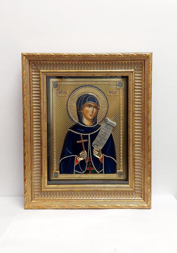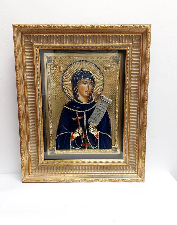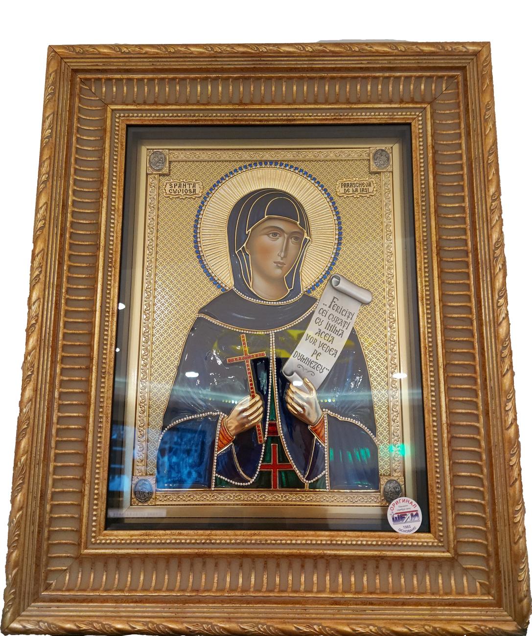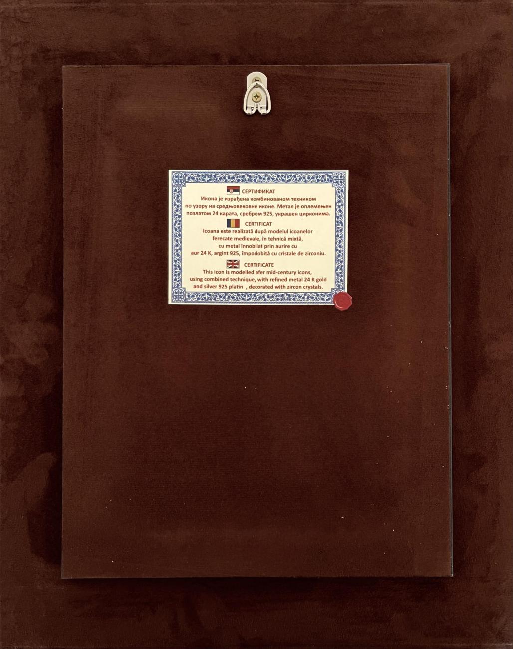 Icoana este realizată după modelul icoanelor ferecate medievale, în tehnică mixtă, cu metal înnobilat prin aurire cu aur 24 k, argint 925, împodobită cu cristale de zirconiu.