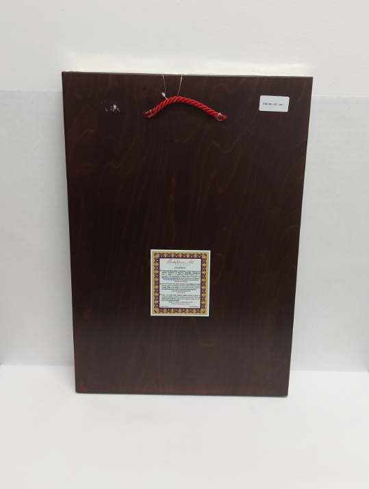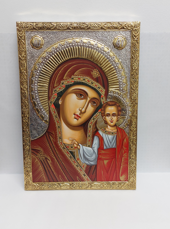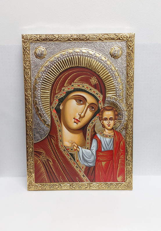 Copie fidelă a unei icoane bizantine. Partea din metal este învelită în argint 999 și aur 24k, iar chipul este realizat pe pânză, păstrând metoda tradițională bizantină transmisă de-a lungul timpului.