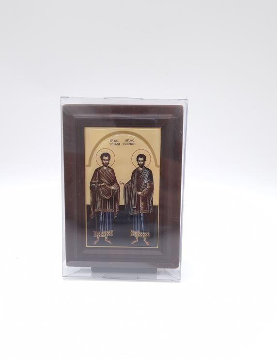 Icoana din rasina pe blat din mdf sf doctori fara de arginti cosma si damian 13x9 cm
