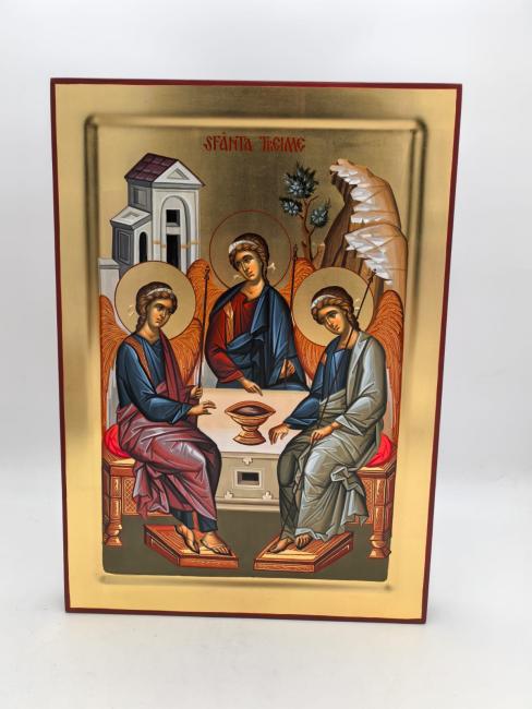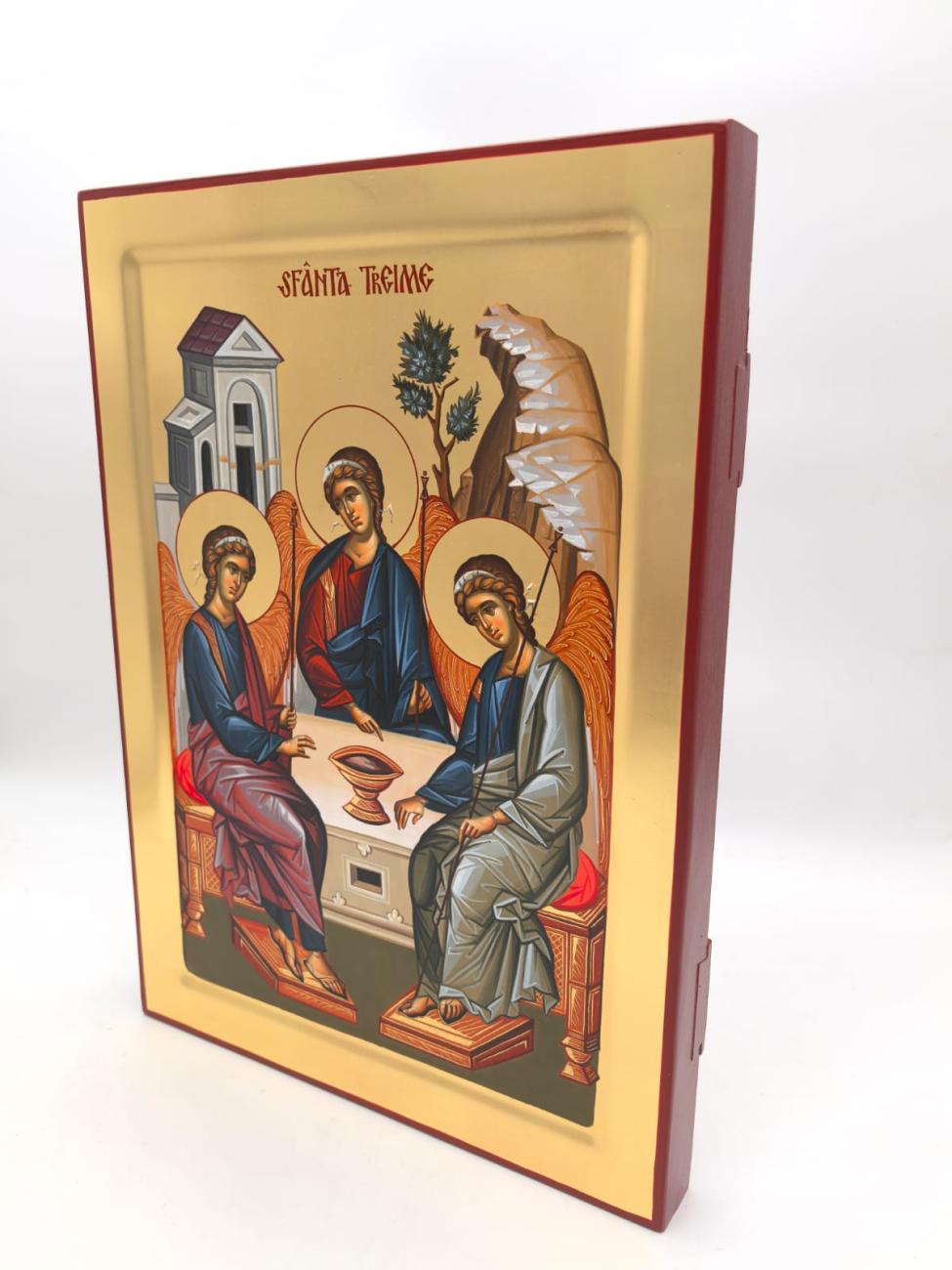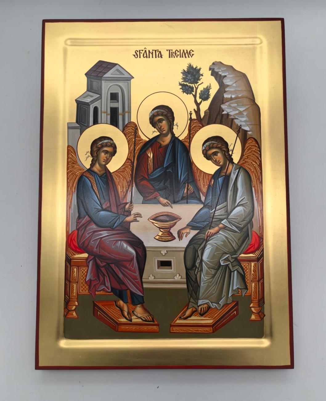 Icoana pictata manual cu foita de aur pe blat de lemn sfanta treime a3