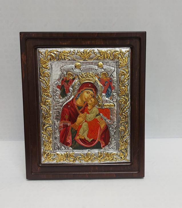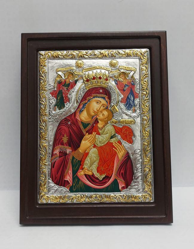 Copie a unei vechi icoane bizantine, realizată manual pe pânză, de pictori cu vastă experiență în tehnica serigrafiei. Pentru a-și menține mereu strălucirea, icoana a fost acoperită cu argint pur 925 în ateliere specializate și recunoscute pentru calitatea și autenticitatea confecționării de odoare bisericești.