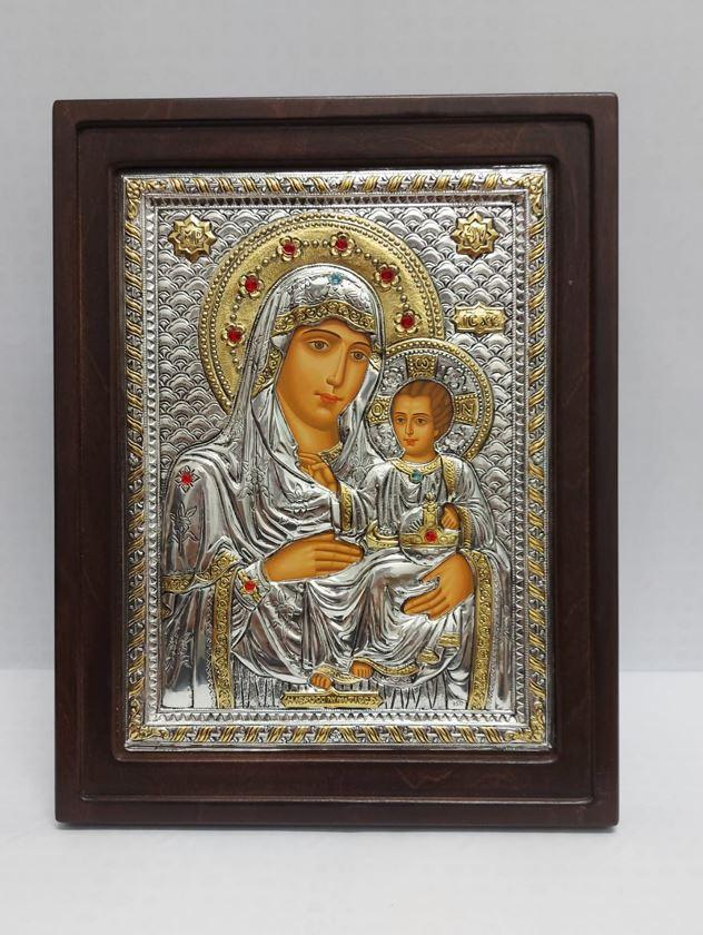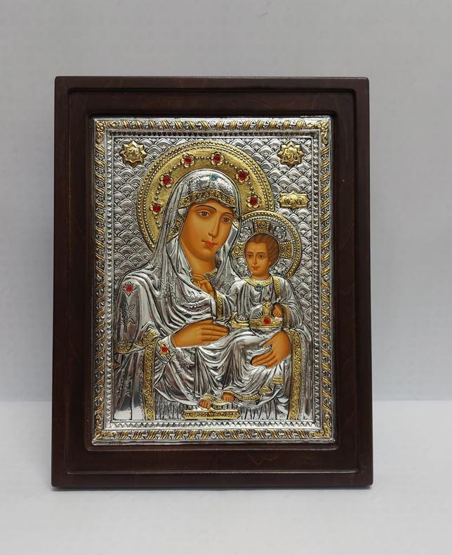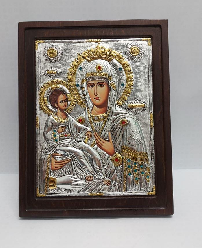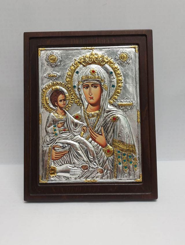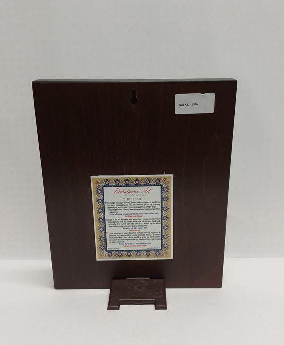 Copie a unei vechi icoane bizantine, realizată manual pe pânză, de pictori cu vastă experiență în tehnica serigrafiei. Pentru a-și menține mereu strălucirea, icoana a fost acoperită cu argint pur 925 în ateliere specializate și recunoscute pentru calitatea și autenticitatea confecționării de odoare bisericești.