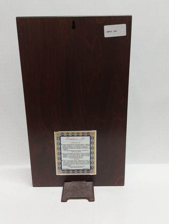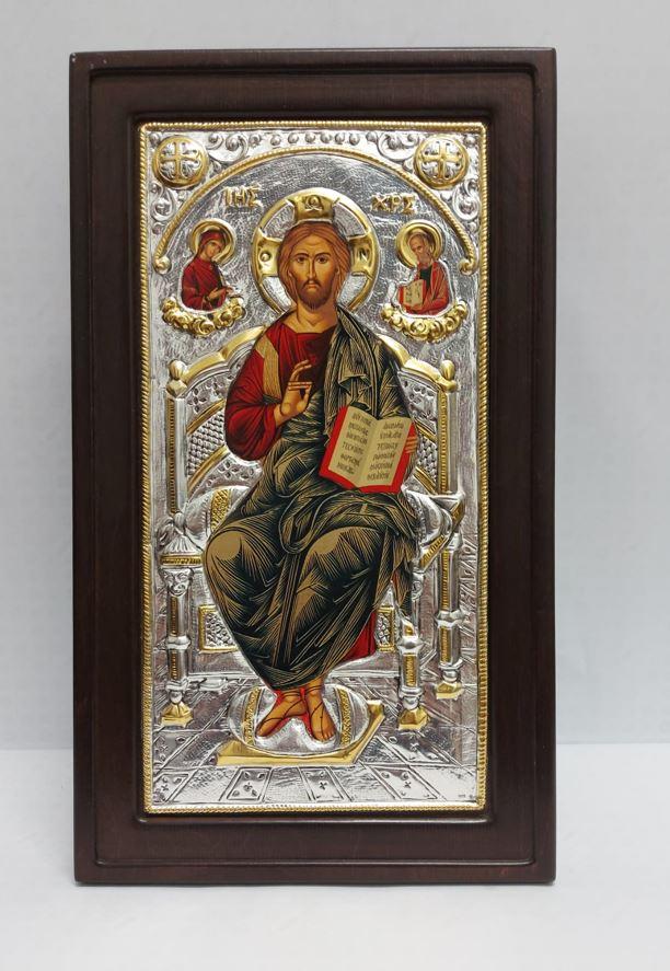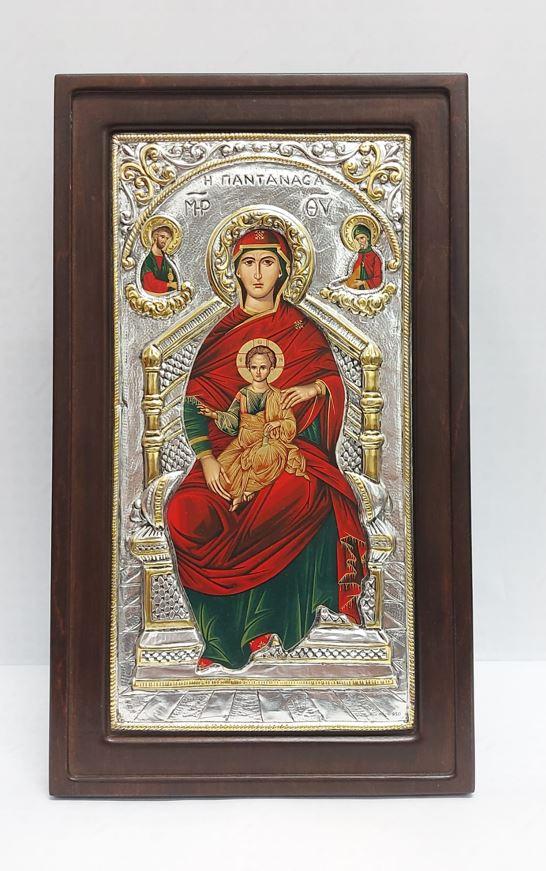 Copie a unei vechi icoane bizantine, realizată manual pe pânză, de pictori cu vastă experiență în tehnica serigrafiei. Pentru a-și menține mereu strălucirea, icoana a fost acoperită cu argint pur 925 în ateliere specializate și recunoscute pentru calitatea și autenticitatea confecționării de odoare bisericești.