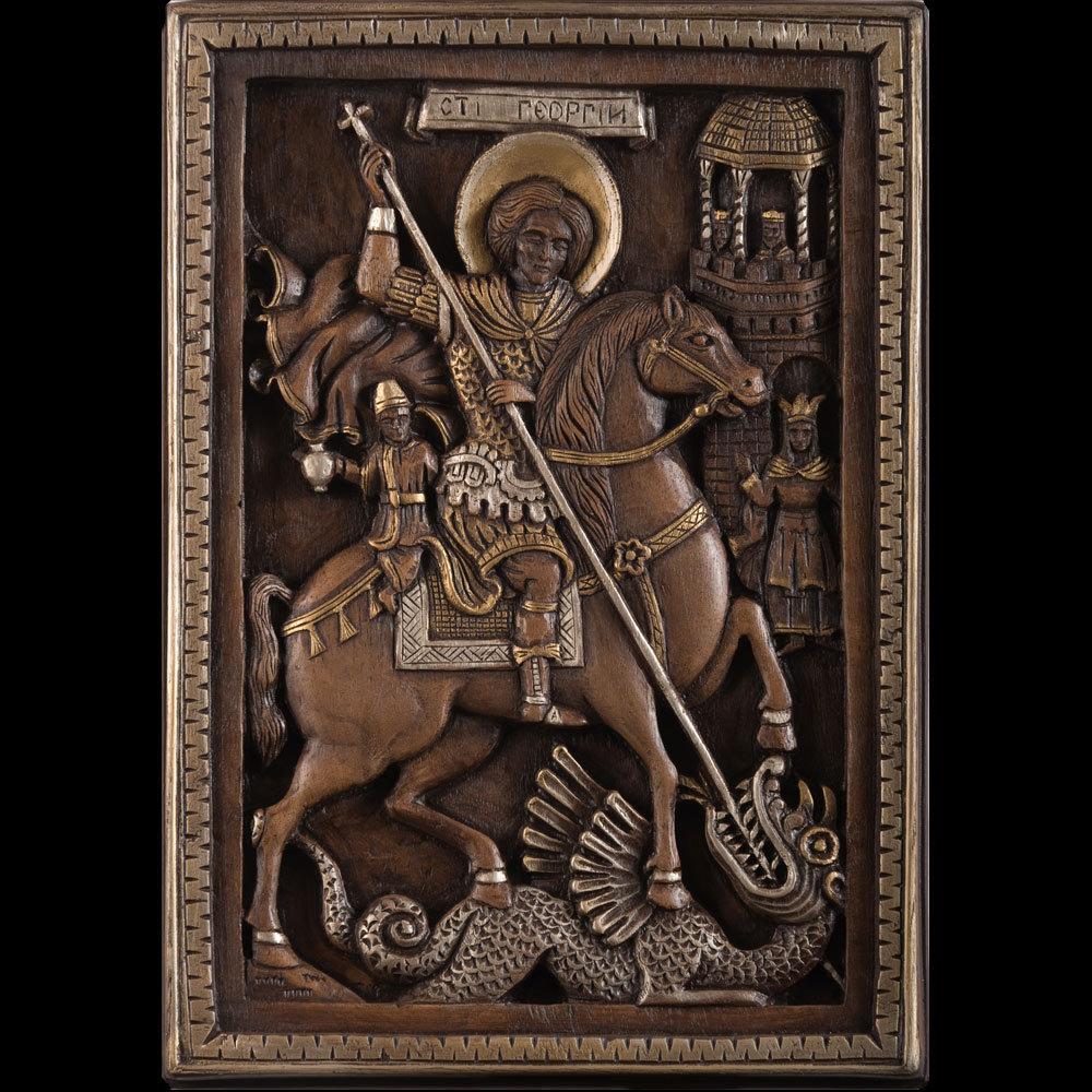 Icoană cu Sfântul Mucenic Gheorghe pictată și sculptată în relief pe suport de lemn cu elemente de aur și argint realizată din materiale ecologice.