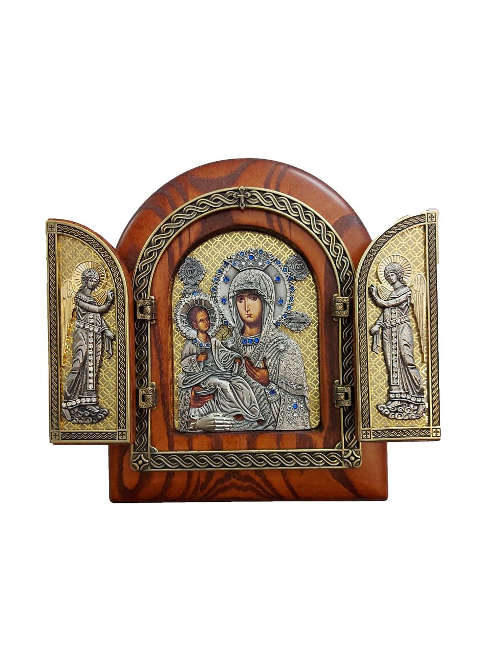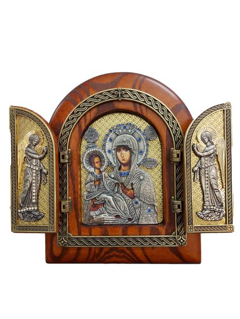 Icoană triptic aurită și argintată ornamentată cu email - Thrihirussa - 22x17 cm
