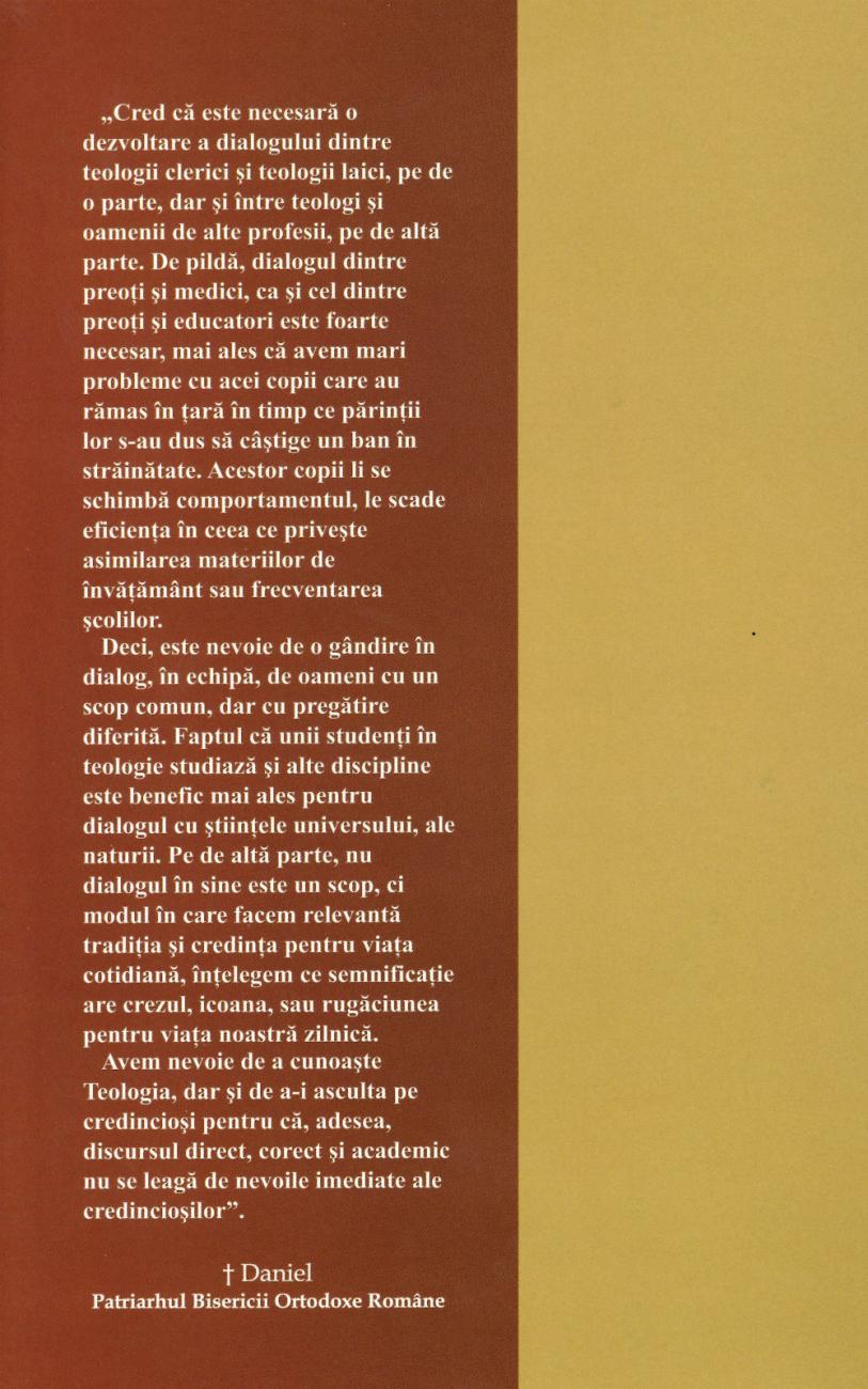 „Cred că este necesară o dezvoltare a dialogului dintre teologii clerici şi teologii laici, pe de o parte, dar şi între teologi şi oamenii de alte profesii, pe de altă parte. De pildă, dialogul dintre preoţi şi medici, ca şi cel dintre preoţi şi educatori este foarte necesar, mai ales că avem mari probleme cu acei copii care au rămas în ţară în timp ce părinţii lor s-au dus să câştige un ban în străinătate. Acestor copii li se schimbă comportamentul, le scade eficienţa în ceea ce priveşte asimilarea materiilor de învăţământ sau frecventarea şcolilor.