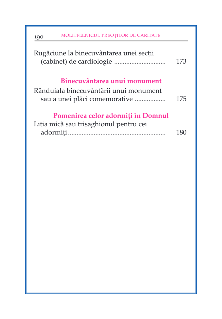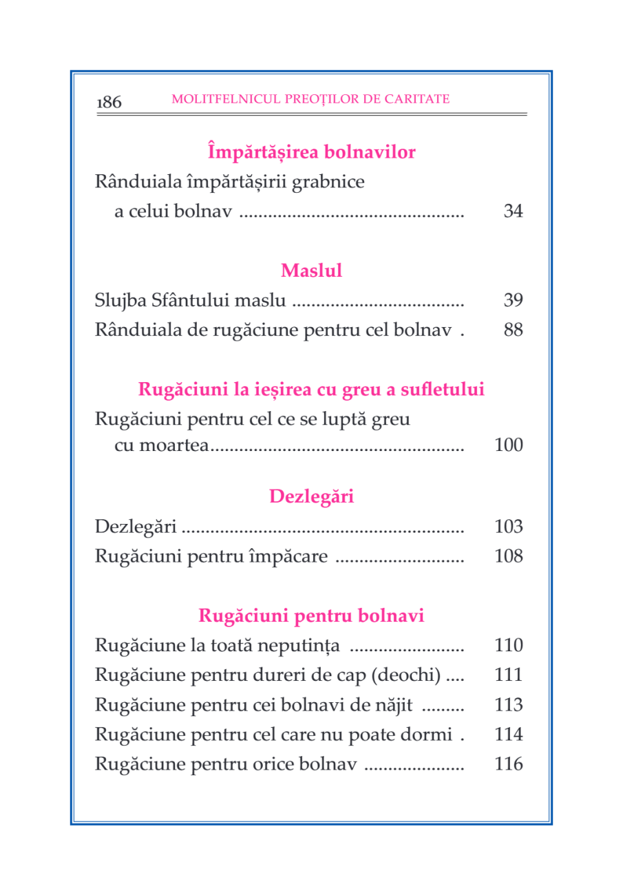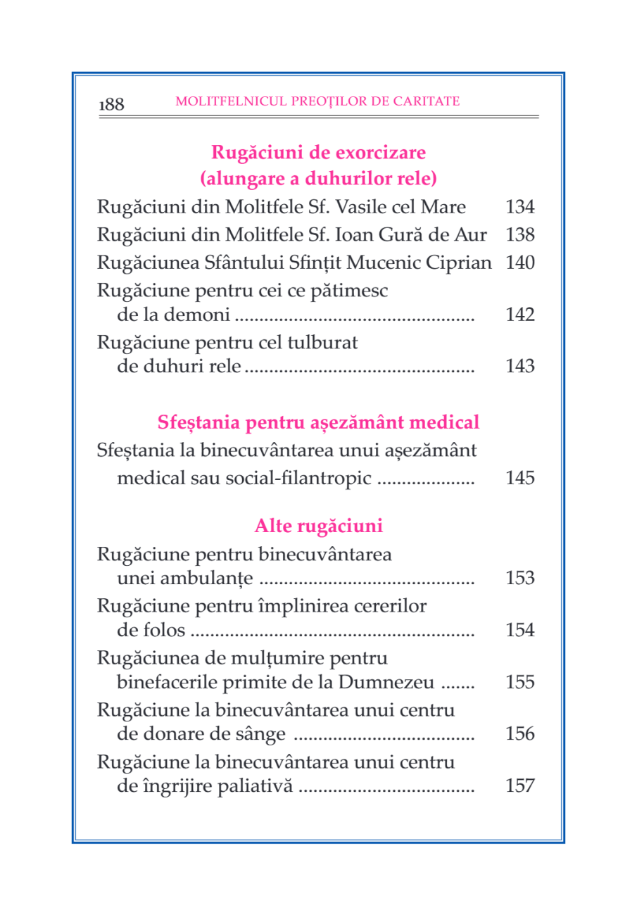 Ediția de față a Molitfelnicului preoților de caritate se adresează clericilor din instituțiile de sănătate, oferindu-le, într-un mod accesibil și bine organizat, textul liturgic folosit în pastorația specifică preotului de caritate. De aceea, prin această lucrare ne-am propus, pe de o parte, să îmbogățim conținutul cu rânduieli și rugăciuni, care pot fi rostite cu diferite prilejuri întâlnite în pastorația de caritate, și, pe de altă parte, să avem o carte de cult ușor de folosit la patul bolnavului și, în același timp, să se prezinte într-un format care să susțină solemnitatea slujirii sfințitoare.