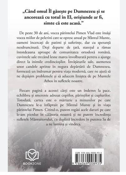 De peste 30 de ani, vocea părintelui Pimen Vlad este însăşi vocea miilor de pelerini care se opresc anual pe Sfântul Munte, oameni încercați de patimi şi suferințe, dar cu speranță nezdruncinată. Deşi departe de țară, starețul a rămas întotdeauna aproape de comunitatea ortodoxă română, cuvintele sale trecând lesne marea învolburată pentru a ajunge direct la inimile credincioşilor. Învăţăturile sale, asemenea unor candele aprinse în negura depărtării de Dumnezeu, formează un îndrumar pentru viața modernă, care ne ajută să ne depăşim problemele şi să aducem liniştea de pe Muntele Athos în sufletele noastre.