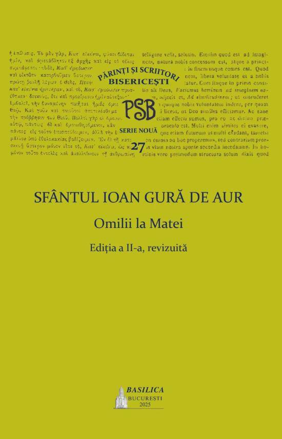 Volumul de față oferă publicului românesc în general, iar clerului, monahilor și credincioșilor ortodocși în special, o nouă ediție a celui mai citit și mai cunoscut comentariu omiletic asupra Evangheliei după Matei, socotită de tradiție prima Evanghelie în ordine cronologică. Autorul tâlcuirii acestei „scrisori de dragoste a lui Dumnezeu pentru oameni”, cum o numește chiar el, este Sfântul Ioan Gură de Aur, unul dintre cei mai mari, mai profunzi și mai echilibrați exegeți ai creștinătății.
